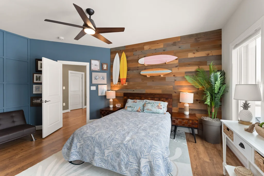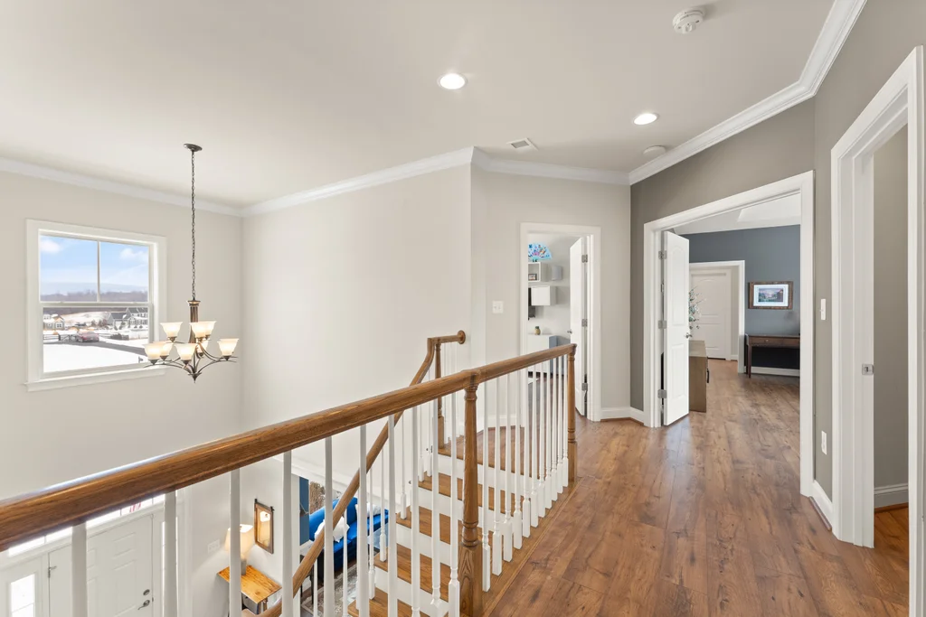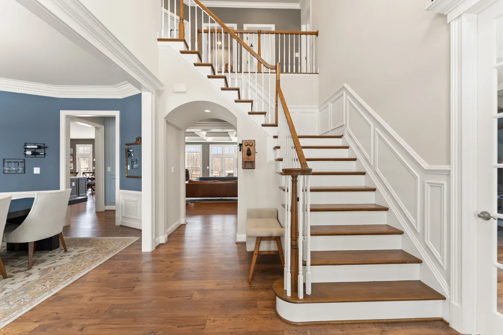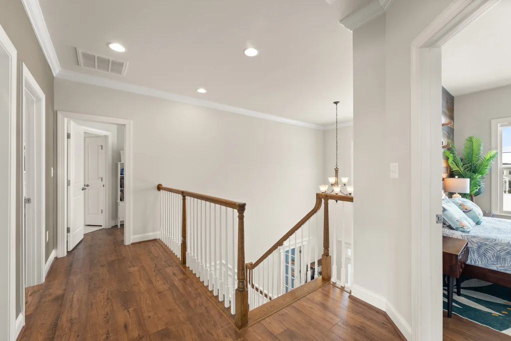 Custom paneling lines the walls along the wood staircase, leading to the second level where the primary suite, three additional bedrooms, and two additional bathrooms are thoughtfully arranged. Luxury vinyl plank flooring continues throughout this level, and the bedrooms and closets are well proportioned, offering comfortable retreats without wasted space.