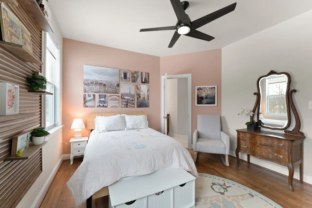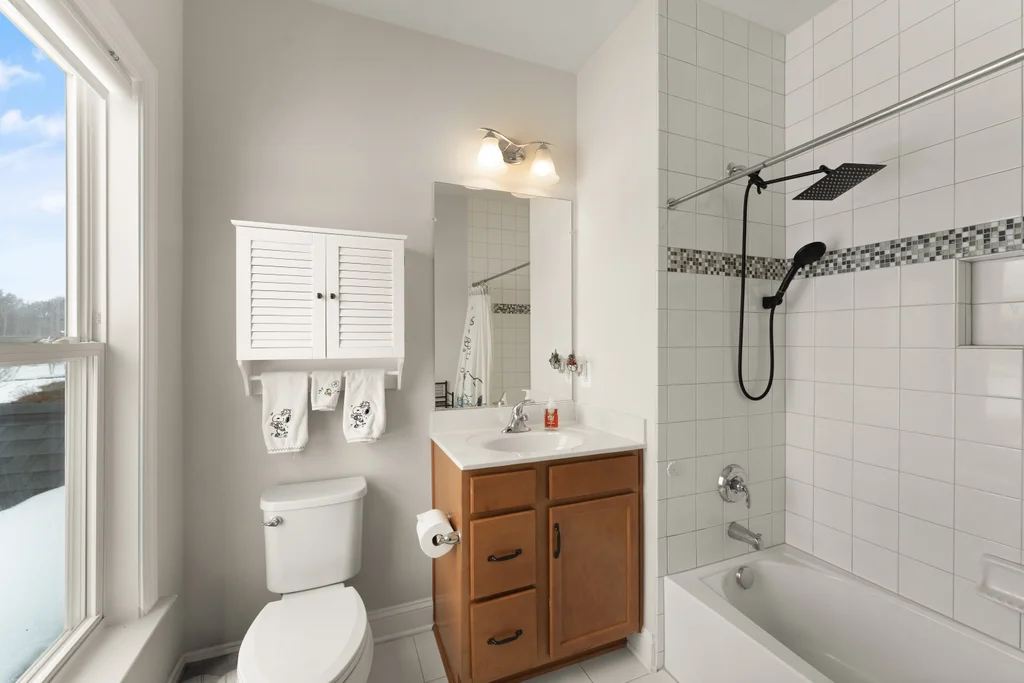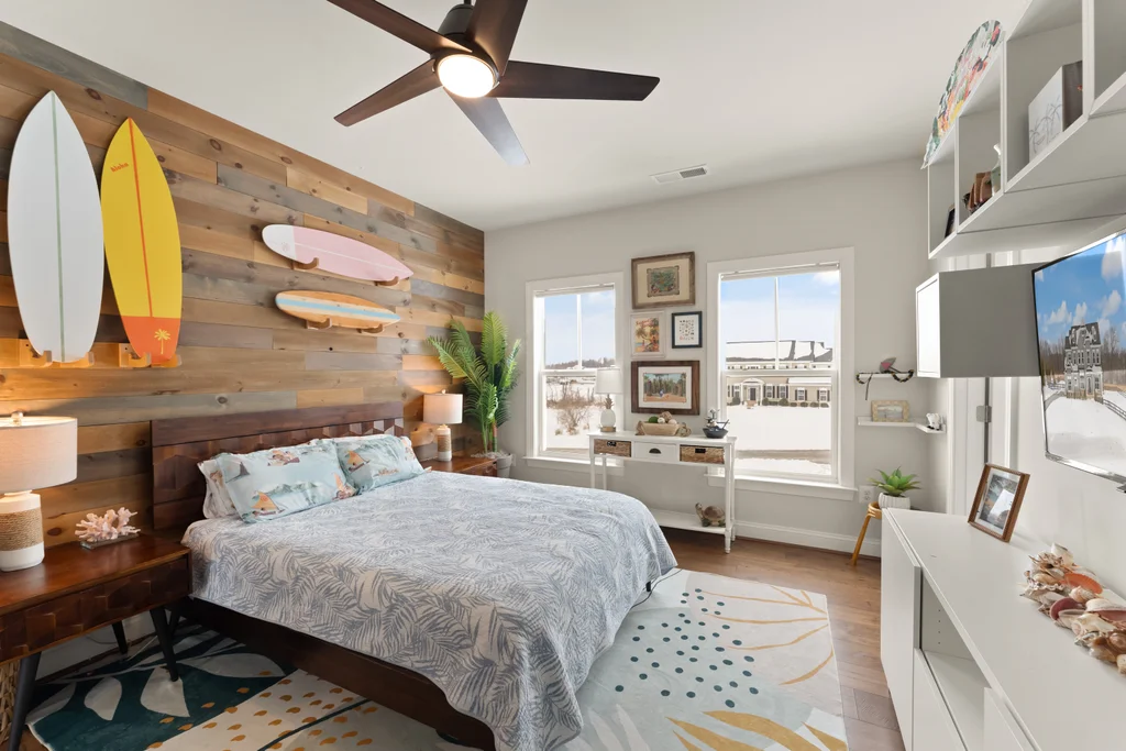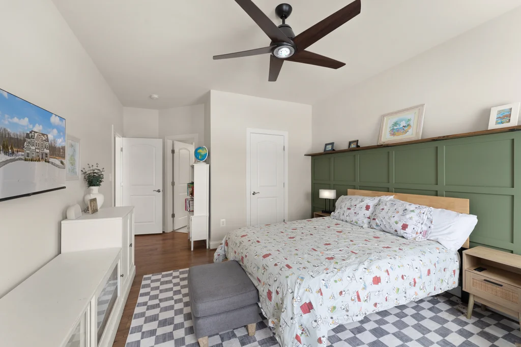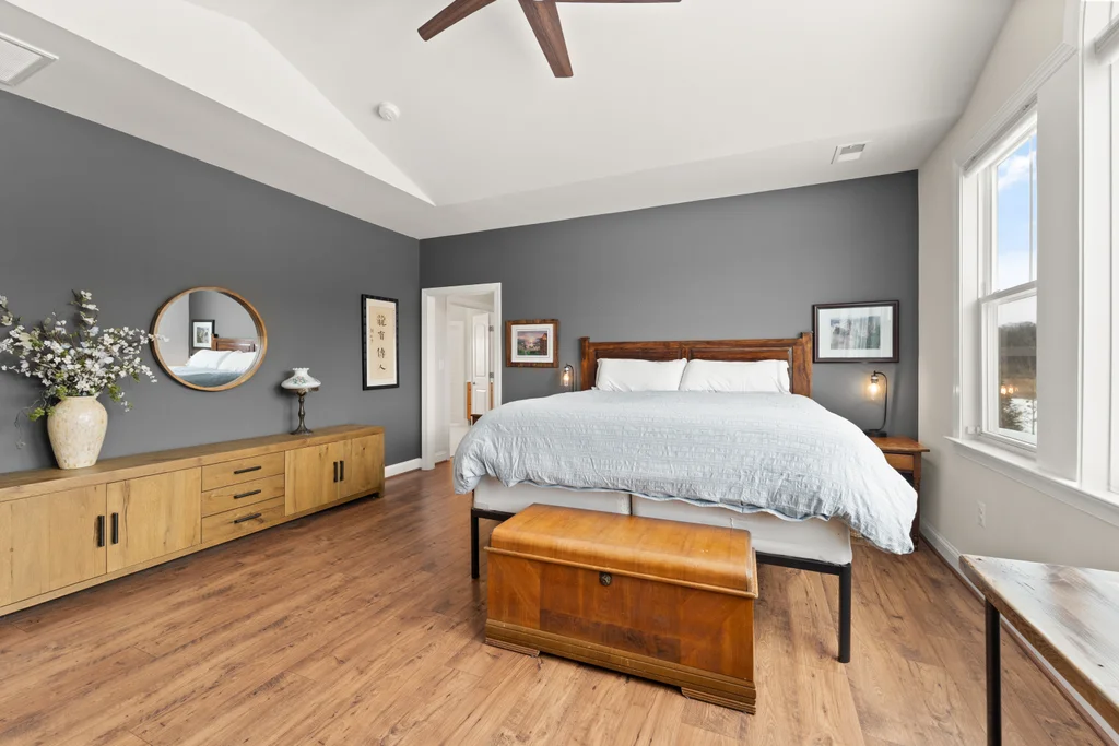 Custom paneling lines the walls along the wood staircase, leading to the second level where the primary suite, three additional bedrooms, and two additional bathrooms are thoughtfully arranged. Luxury vinyl plank flooring continues throughout this level, and the bedrooms and closets are well proportioned, offering comfortable retreats without wasted space.