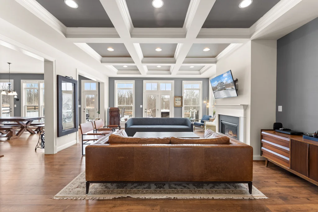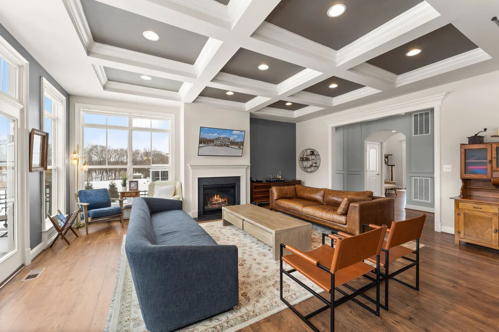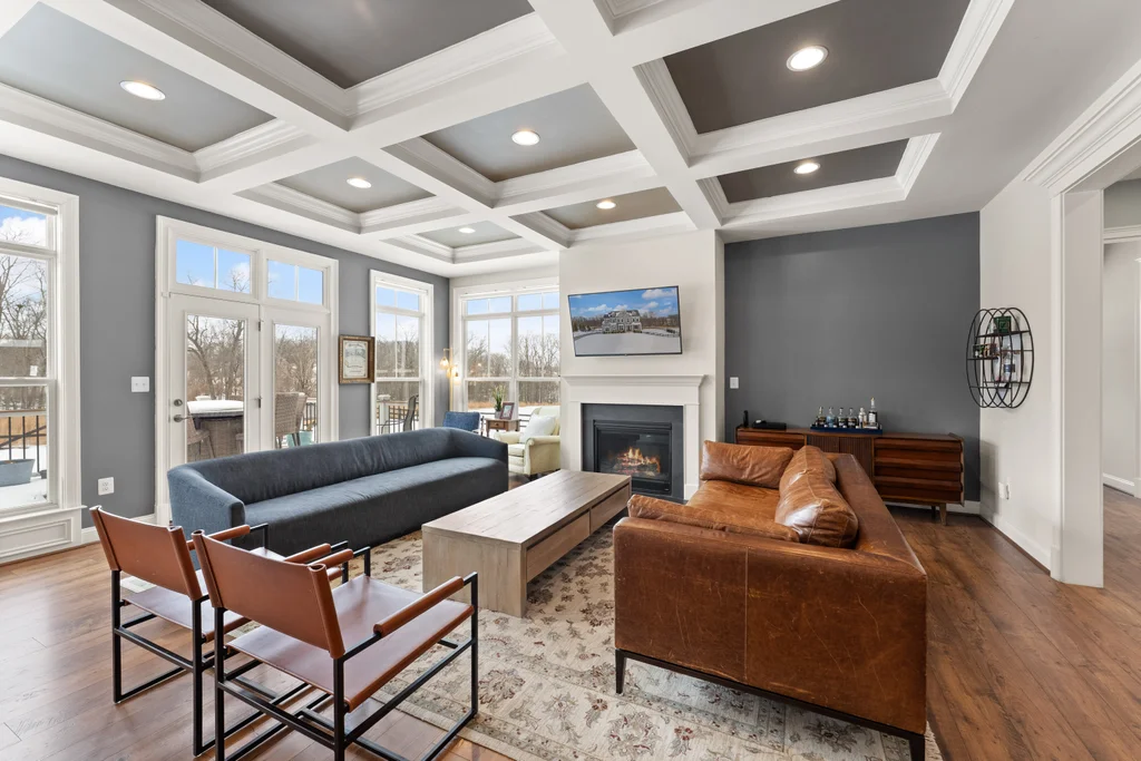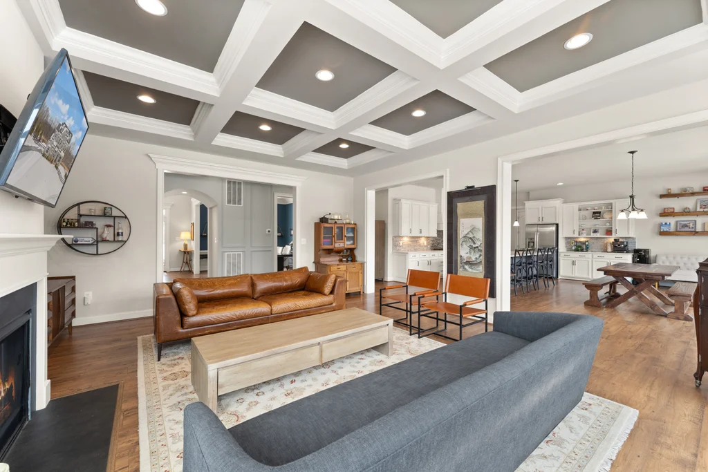 The main level makes a strong first impression with a grand two-story foyer and features luxury vinyl plank flooring throughout, a dedicated home office, and an additional library or flex room ideal for a playroom, study, or creative space. A formal dining room flows effortlessly into the inviting family room, where ample natural light filters in, giving the home a special glow and a sense of openness, cleanliness, and warmth. A coffered ceiling and cozy fireplace add architectural interest and comfort.