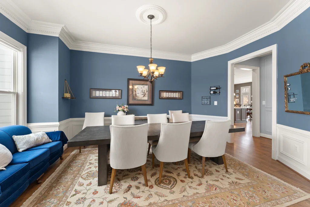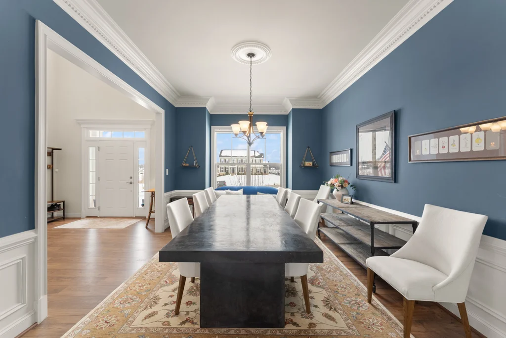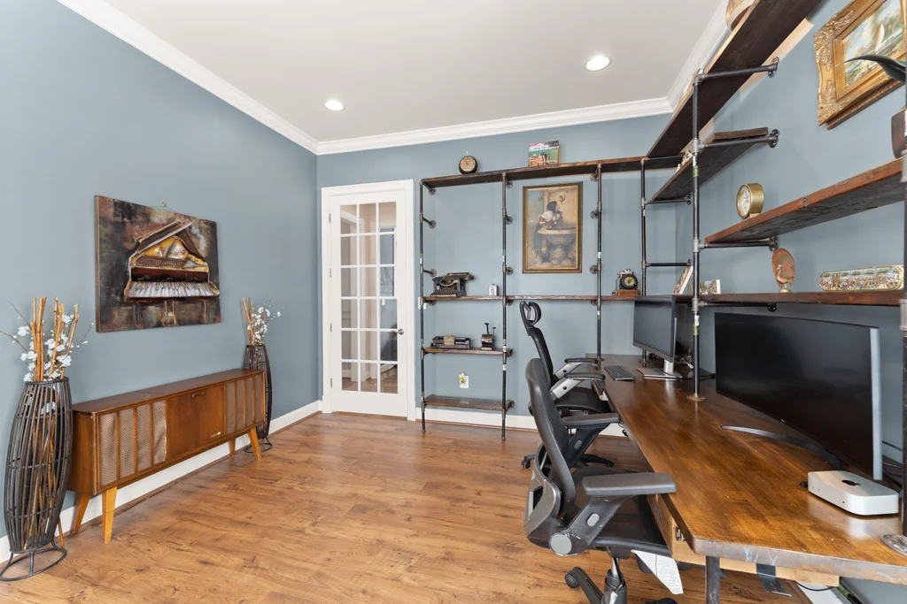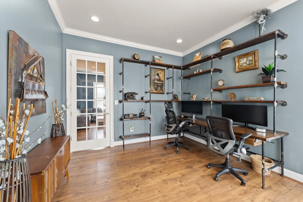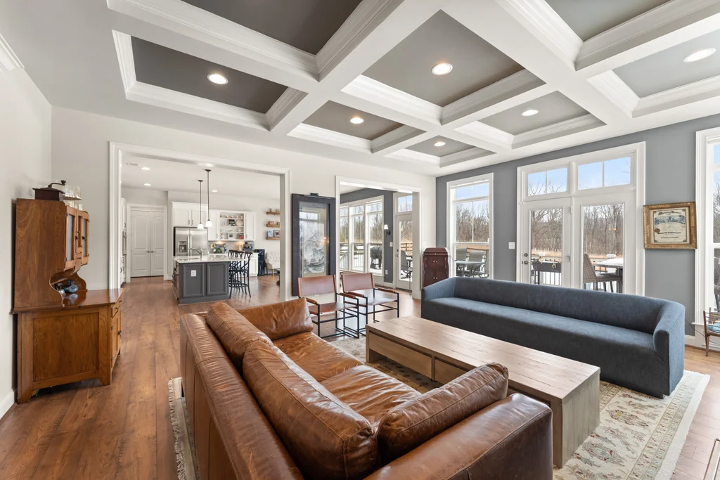 The main level makes a strong first impression with a grand two-story foyer and features luxury vinyl plank flooring throughout, a dedicated home office, and an additional library or flex room ideal for a playroom, study, or creative space. A formal dining room flows effortlessly into the inviting family room, where ample natural light filters in, giving the home a special glow and a sense of openness, cleanliness, and warmth. A coffered ceiling and cozy fireplace add architectural interest and comfort.