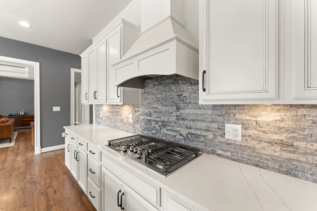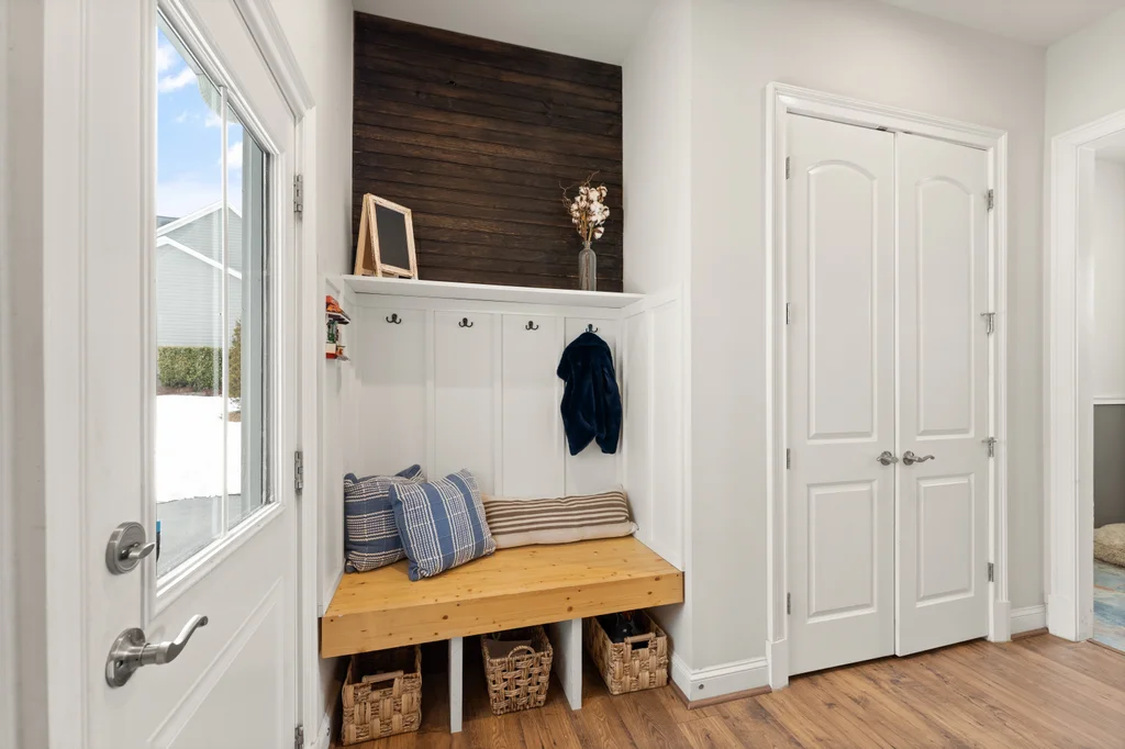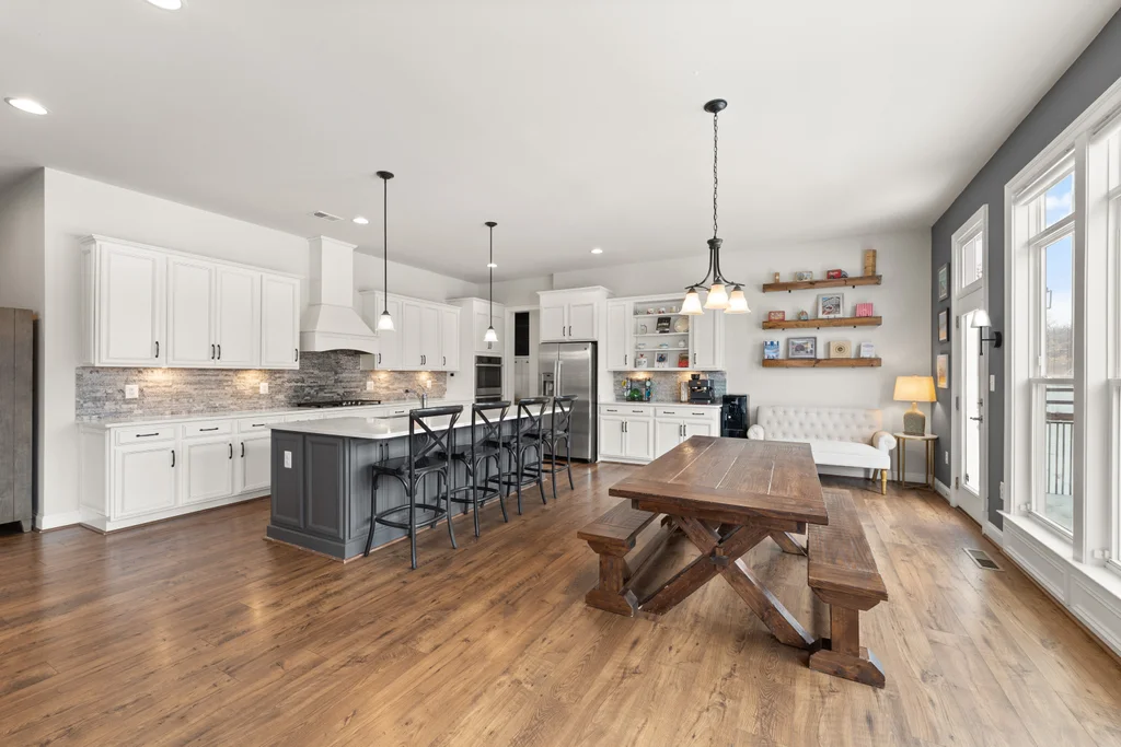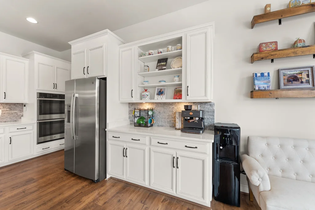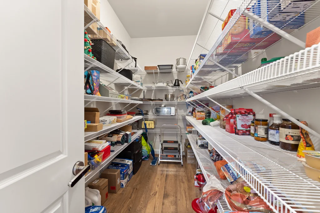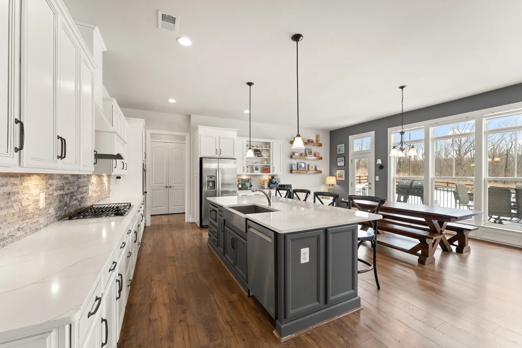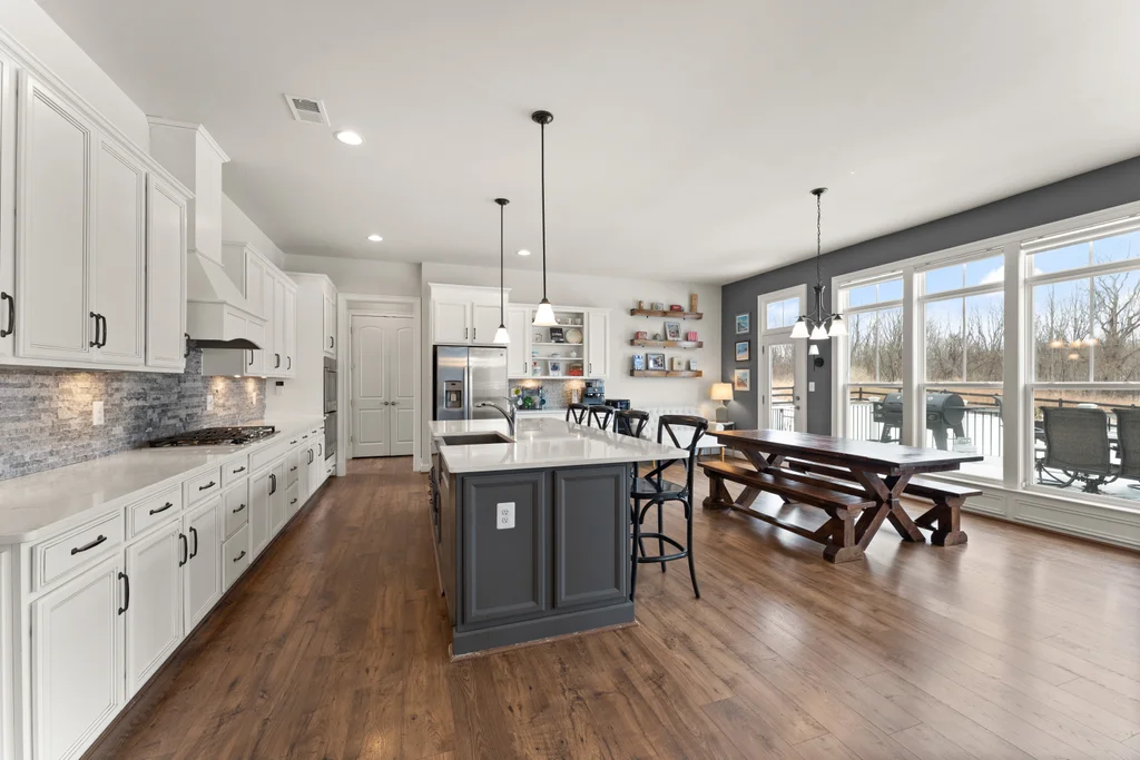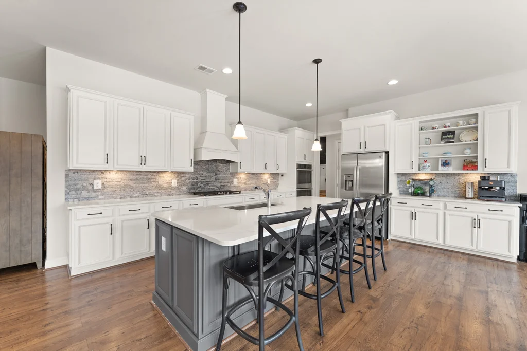 The kitchen is designed to be both beautiful and highly functional, anchored by an expansive island that invites gathering and conversation. A striking backsplash, generous counter space, and a large walk-in pantry support everyday cooking and entertaining with ease. Beyond the kitchen, a separate entrance alongside the side-load two-car garage leads to a well-placed mudroom, adding convenience and practicality to daily routines.